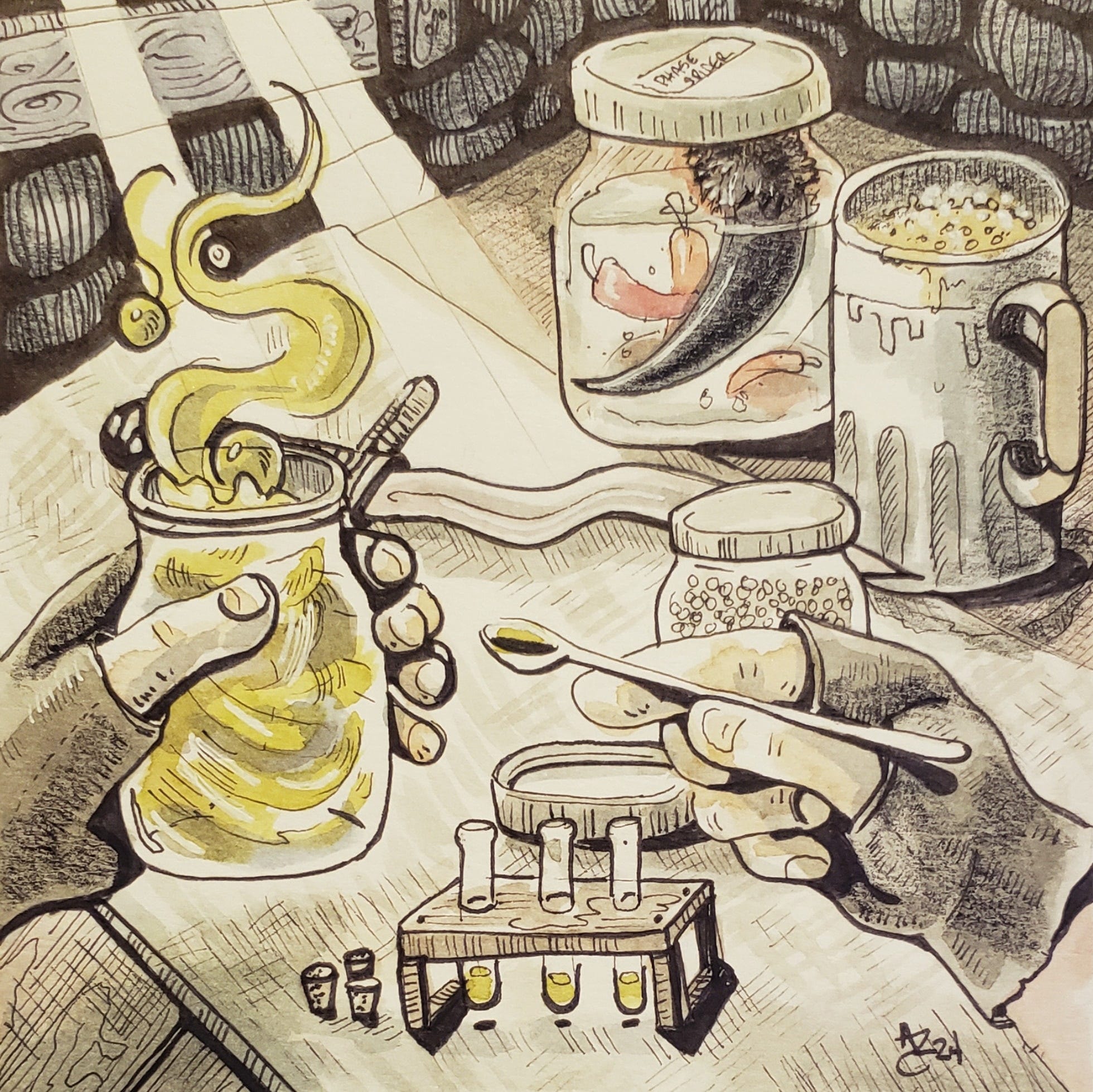 I'm fascinated by which items you chose to focus on. There are number of details that you chose to pick out based on your own associations and experiences. Maybe that's why I like it when a few elements in the image are more ambiguous; just showing a bubbly liquid as opposed to labeling the jar "Poison" . Then it's easier for the viewer to add their own interpretation.